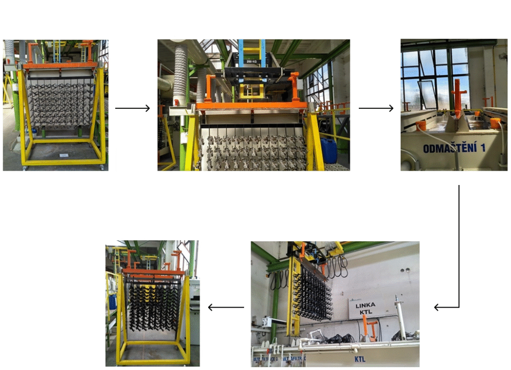 Díly na závěsu po KTL a prvním oplachu ultrafiltrátem a závěs v KTL. kde dochází k nanášení vrstvy KTL
